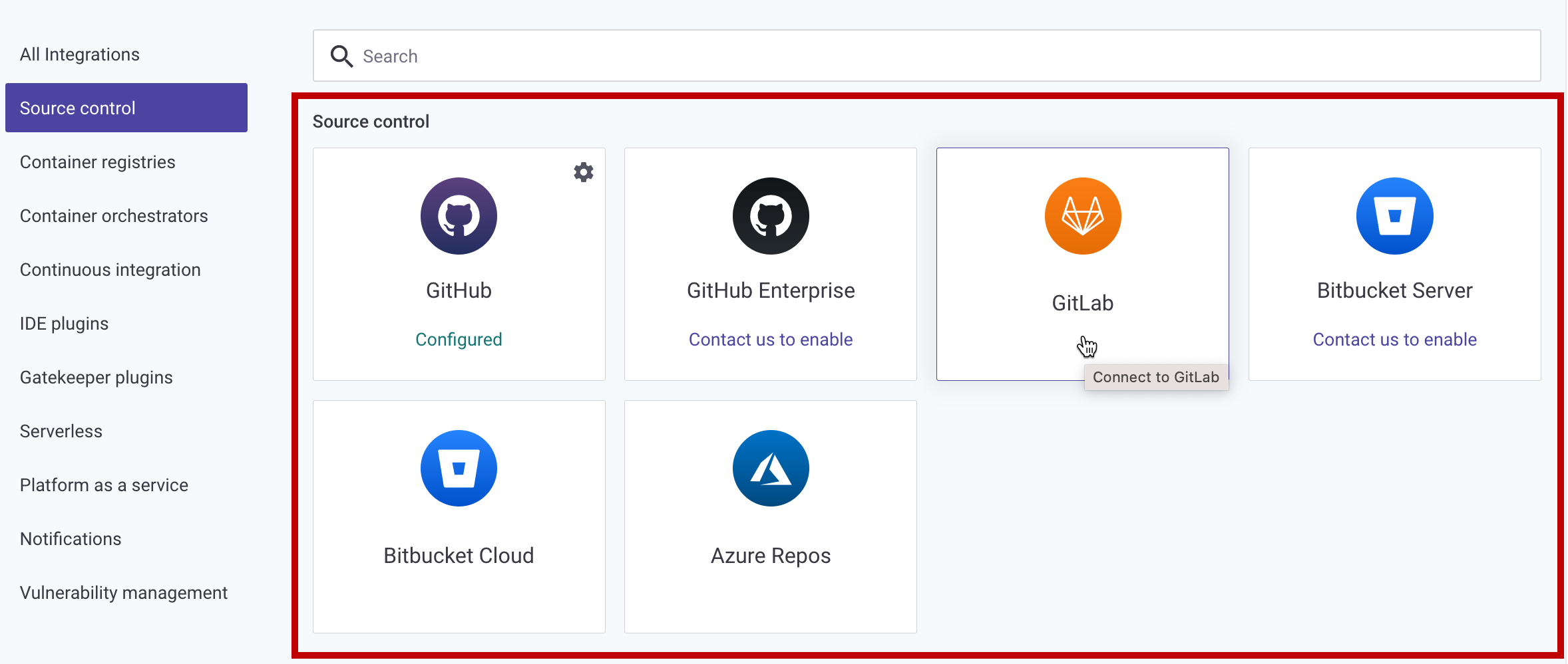 2\. From the available **Source control** options, select the Source Control system you want to integrate with Snyk Code: